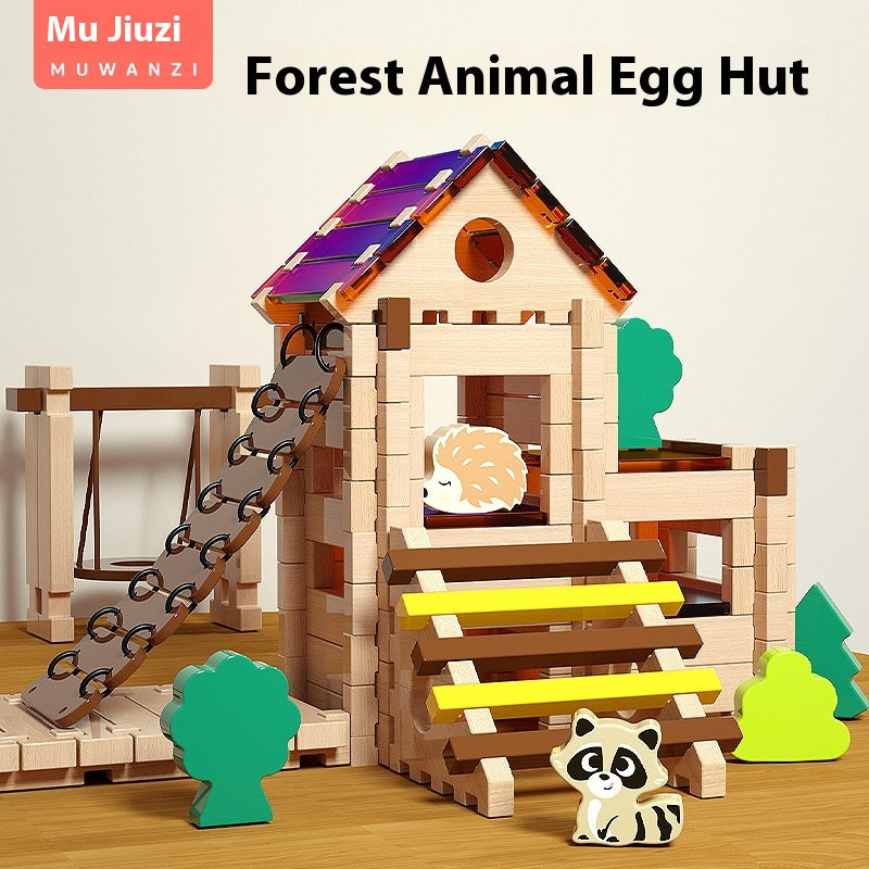 Hecho con madera resistente y colores cálidos, pensado para el juego libre y sin pantallas. Favorece la coordinación, la paciencia y la imaginación, mientras los peques inventan historias donde el león, el oso y el mapache son los protagonistas.